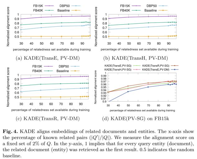 本文还验证了KADE的对齐效果,提出了一个评价对齐效果的指标normalizedalignment score, 这是一个介于0到1之间的值且值越大说明对齐效果越好。我们构造了一个对齐的baseline通过非线性函数实现文本表示学习向量空间和知识图谱表示学习向量空间的互相转换,实验结果如下: