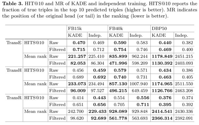 本文的实验主要采用了三个数据集,FB15k, FB40K和DBP50。实验中知识图谱表示学习采用了TransE,TransH 和TransD,并在链接预测任务上进行了测试,实验结果如下并表明了KADE对知识图谱表示学习模型本身的效果没有影响且稍有提升。