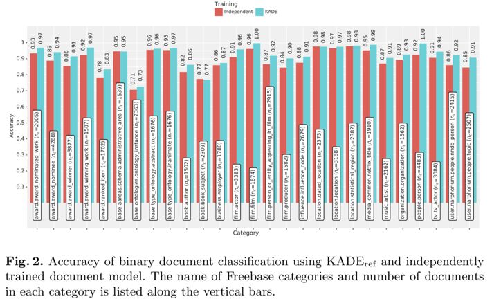 实验中文本表示学习模型采用了PV-DM, 并在文本分类任务上进行了测试,实验结果如下并标明了KADE对文本表示学习模型的效果没有影响且有明显提升。