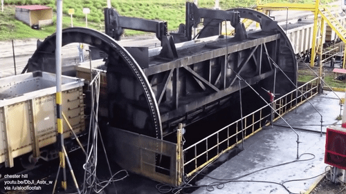 △ 运煤火车在发电厂这样卸货。这种火车的卸货设备叫做转筒式翻车机,它是最常用的铁路翻车机,用于自动卸载没有盖子的火车车厢。
