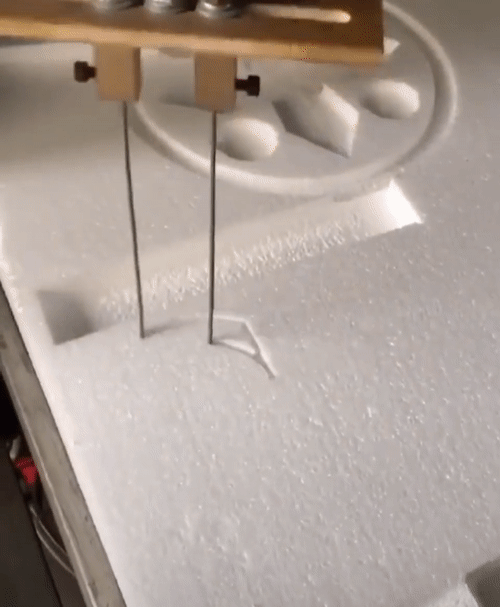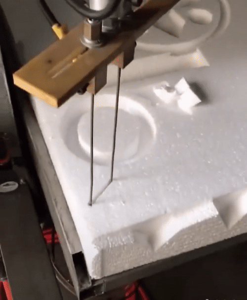 △ 泡沫塑料切割车床利用电热丝刀具,可以切割出形状多样的泡沫塑件,这些泡沫塑件可以进一步用在包装、建筑,还有3D制图教学中。你收到的快递的泡沫塑料包装可能就是这么来的。