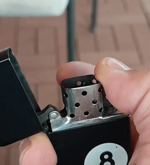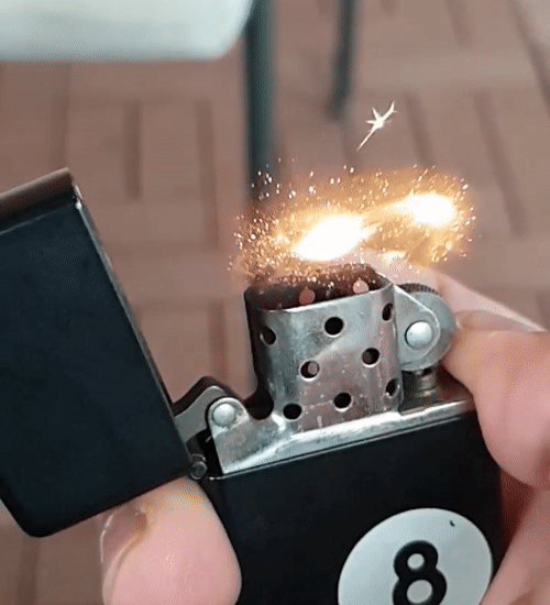 △ 打火石式打火机打火的过程。这种打火机的那圈圆形的转轮和打火石(也叫发火合金,铁铈齐)摩擦,打火石产生火花,火花点燃打火机口部的气态燃料。