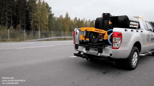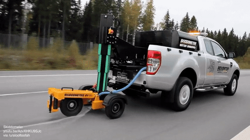 △ 测飞机场跑道摩擦力的机器。前面的管子喷射测试液,后面的测试轮记录摩擦力数据。