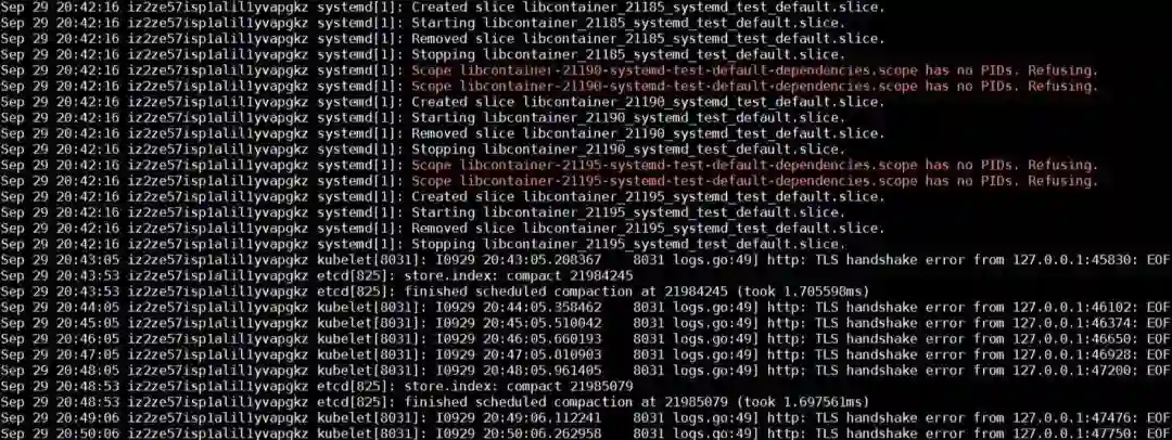 当集群节点进入 NotReady 状态的时候,我们需要做的第一件事情,是检查运行在节点上的 kubelet 是否正常。在这个问题出现的时候,使用 systemctl 命令查看的kubelet 状态(kubelet 是 systemd 管理的一个 daemon )发现它是正常运行的。当我们用 journalctl 查看 kubelet 日志的时候,发现以下错误。