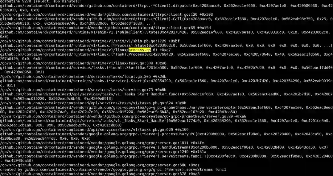 与 docker daemon 类似,我们可以通过 kill -SIGUSR1 <pid> 命令来输出containerd 的调用栈。不同的是,这次调用栈会直接输出到 messages 日志。