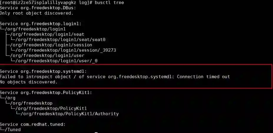 因为无计可施,所以只能做各种测试、尝试。使用 busctl tree 命令,可以输出所有bus 上对外暴露的接口。从输出结果看来,org.freedesktop.systemd1 这个 bus 是不能响应接口查询请求的。