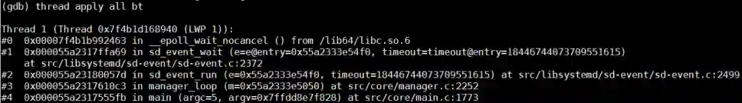 因为重启 systemd 解决了问题,而这个问题本身,是 runC 在使用 dbus 和systemd 通信的时候没有了响应,所以我们需要验证的第一件事情,就是 systemd不是有关键线程被锁住了。查看 core dump 里所有线程,只有以下一个线程,此线程并没有被锁住,它在等待 dbus 事件,以便做出响应。
