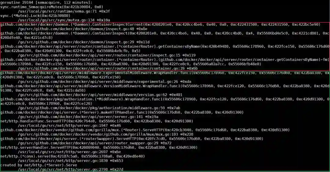 Docker daemon 进程的调用栈是比较容易分析的。稍加留意,我们会发现大多数的调用栈都长成下图中的样子。通过观察栈上每个函数的名字,以及函数所在的文件(模块)名称,我们可以了解到,这个调用栈的下半部分,是进程接到 http 请求,做请求路由的过程;而上半部分则是具体的处理函数。最终处理函数进入等待状态,等待一个mutex实例。