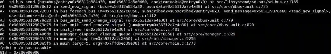 我们使用 gdb 打印出 dbus->cookie 这个值,可以很清楚看到,这个值超过了0xffffffff 。所以看起来,问题是 systemd 在加封过大量 message 之后,cookie 这个值32位溢出了,导致新的消息不能被加封,从而使得 systemd 对 runC 没有了响应。