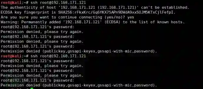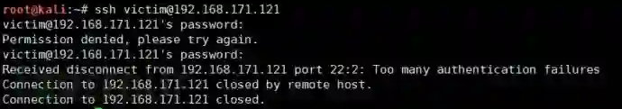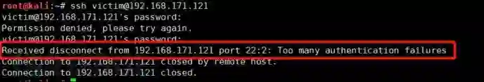 2)检测发现目标主机存在ssh服务,尝试登陆几次判断是否存在登陆次数限制或登陆地址限制情况: