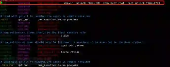 增加如上所示一条记录该条记录,表示登陆失败超过三次后就锁定300秒,root账户如果三次尝试后也不行将被锁定1200秒。