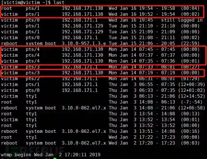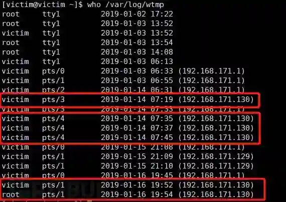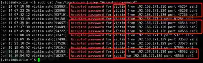 cat /var/log/secure | grep “Accepted password for victim from 192.168.171.130” 记录登陆成功的时间点然后判断是否跟暴力破解的时间段一致,如果一致则表示该账户是被爆破成功登陆。或者直接找管理员确认登陆信息是否正常。