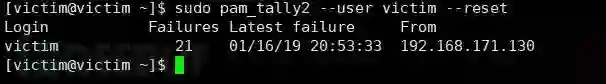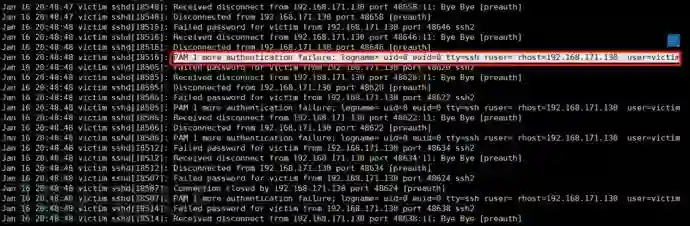 Jan 14 07:37:08 victim unix_chkpwd[54691]: password check failed for user (victim)Jan 14 07:37:08 victim sshd[54689]: pam_unix(sshd:auth): authentication failure; logname= uid=0 euid=0 tty=ssh ruser= rhost=192.168.171.130 user=victimJan 14 07:37:10 victim sshd[54689]: Failed password for victim from 192.168.171.130 port 48548 ssh2
