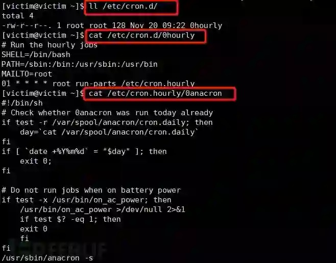 4)查看/etc/cron.daily/ /etc/cron.weekly/ /etc/cron.hourly/ /etc/cron.monthly/ 这些文件夹下面是否存在定时任务