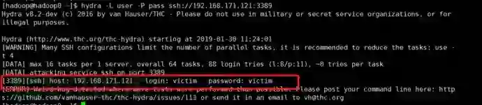 1)在命令行下使用hydra加载用户名、密码字典对目标ssh服务开展爆破行为: