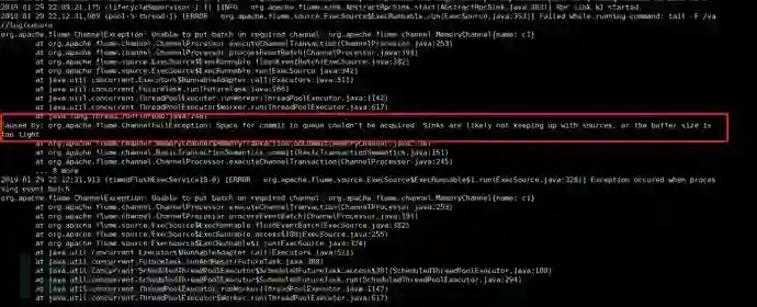 这里表示增加channels中queue的大小,默认为100,如果使用默认值,当处理大量的日志时就会发生如下报错情况。