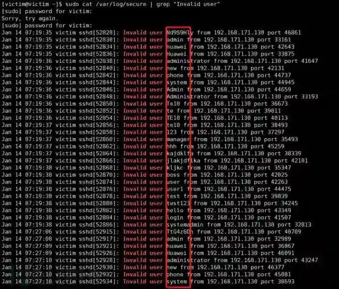 Jan 14 07:37:41 victim sshd[54715]: Invalid user victim1 from 192.168.171.130 port 48550Jan 14 07:37:41 victim sshd[54715]: input_userauth_request: invalid user victim1 [preauth]