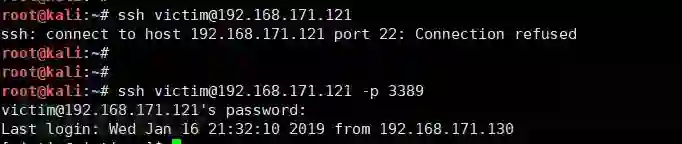4.4)重启sshd服务然后尝试用22端口连接victim主机发现是无法连接的使用3389端口是可以的