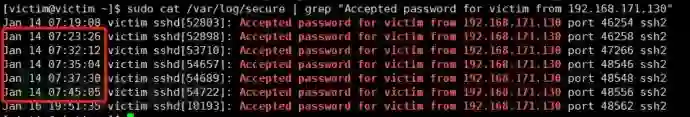 Jan 14 07:37:30 victim sshd[54689]: Accepted password for victim from 192.168.171.130 port 48548 ssh2Jan 14 07:37:30 victim sshd[54689]: pam_unix(sshd:session): session opened for user victim by (uid=0)