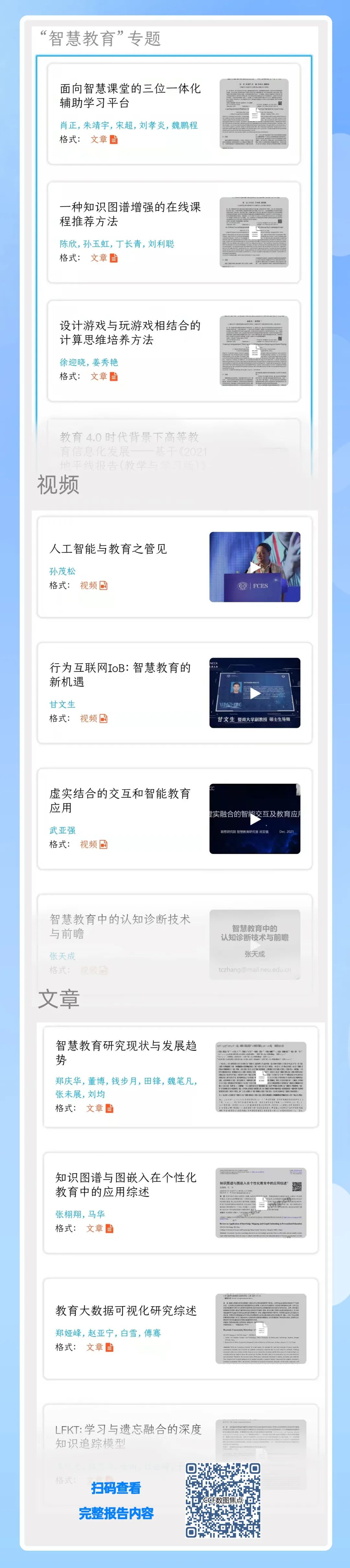 本期焦点整合了CCF会刊以及相关会议资源,组织了1个期刊专题、6篇期刊论文和7个会议报告视频。其中,《软件导刊》2022年第1期出版的“智慧教育” 专题主要探讨了智慧课堂、在线课程推荐、游戏化学习、AI双师教学、智慧校园、教育信息化、计算机支持协作学习等内容,研究如何应用智能技术赋能教育;选自《计算机研究与发展》等优秀会刊的6篇论文,主要介绍了智慧教育不同方向的综述和展望,以及相关模型、算法和技术应用情况;而来自CNCC2021、CCF NCCA2021等会议的7个视频报告,则从智慧教育的研究热点、现状出发,扩展到目前该领域的学术前沿以及对未来挑战的展望。本期焦点旨在为推动我国智慧教育领域的进一步深入研究提供借鉴,希望能够有更多的从业者共同关注这一领域的研究与发展。