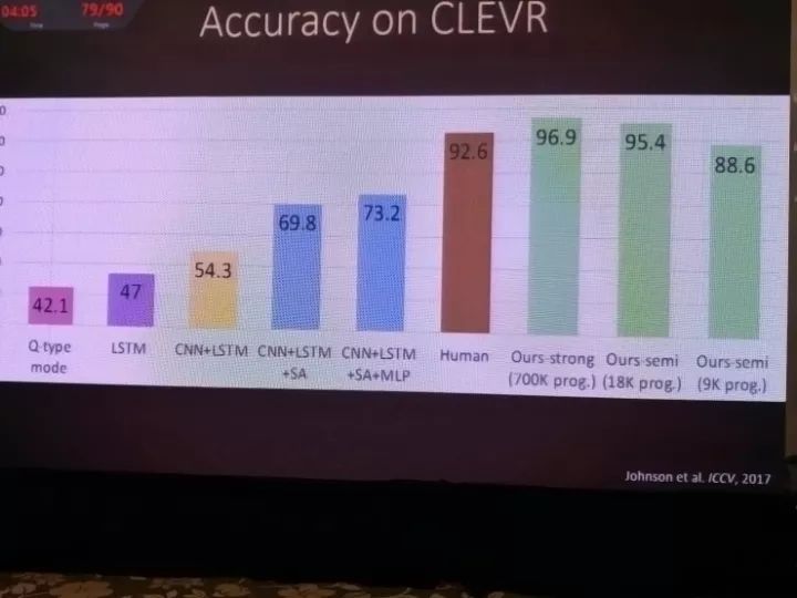 而在ICCV 2017上,他们介绍了新一篇论文中的成果。借助新的CLEVR数据集,把一个问题分解成带有功能的程序段,然后在程序段基础上训练一个能回答问题的执行引擎。这个方案在尝试推理真实世界问题的时候就具有高得多的组合能力。