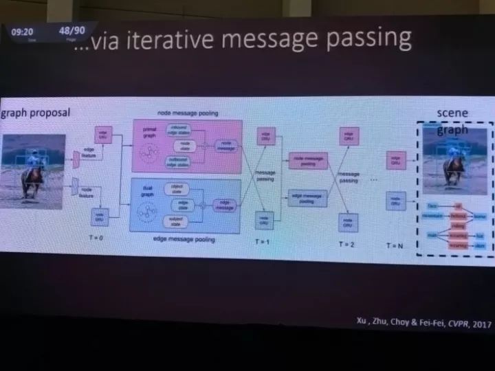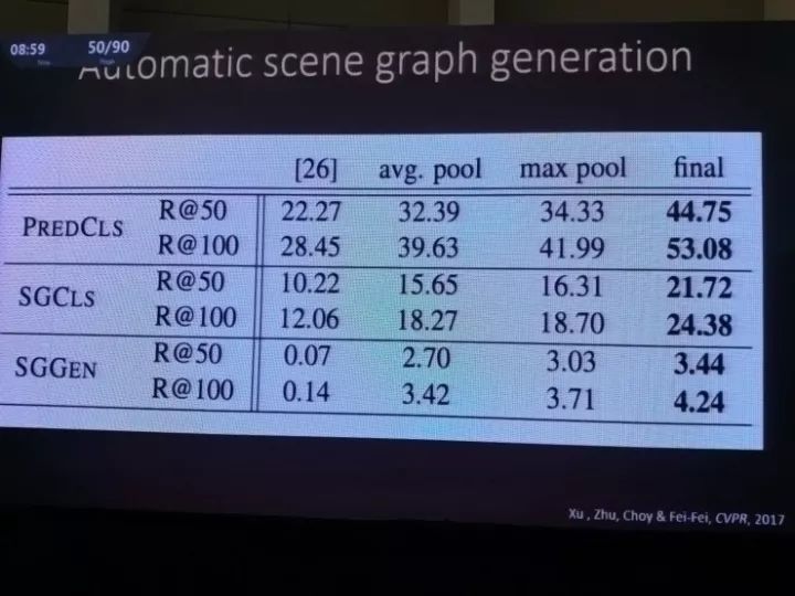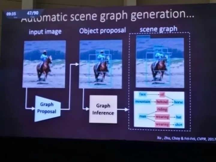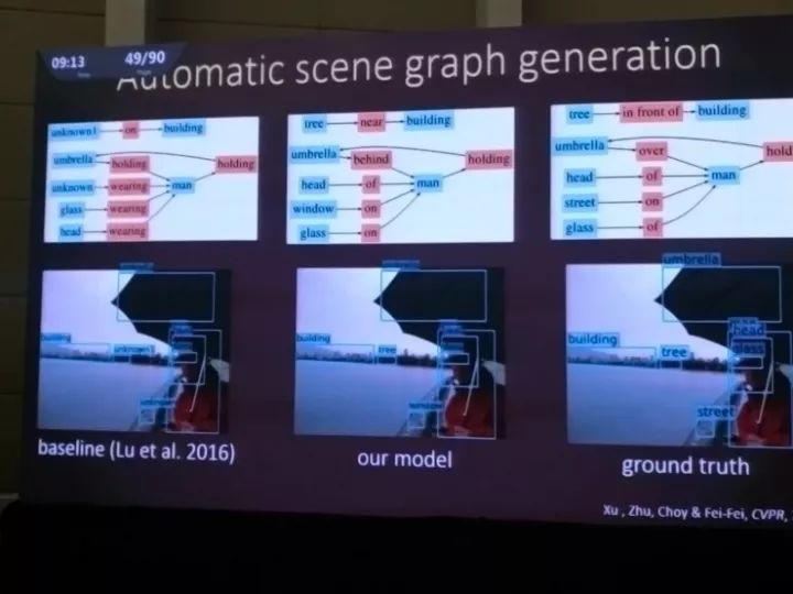 比如这项她和她的学生们共同完成的CVPR2017论文就是一个自动生成场景图的方案,对于一张输入图像,首先得到物体识别的备选结果,然后用图推理算法得到实体和实体之间的关系等等;这个过程都是自动完成的。
