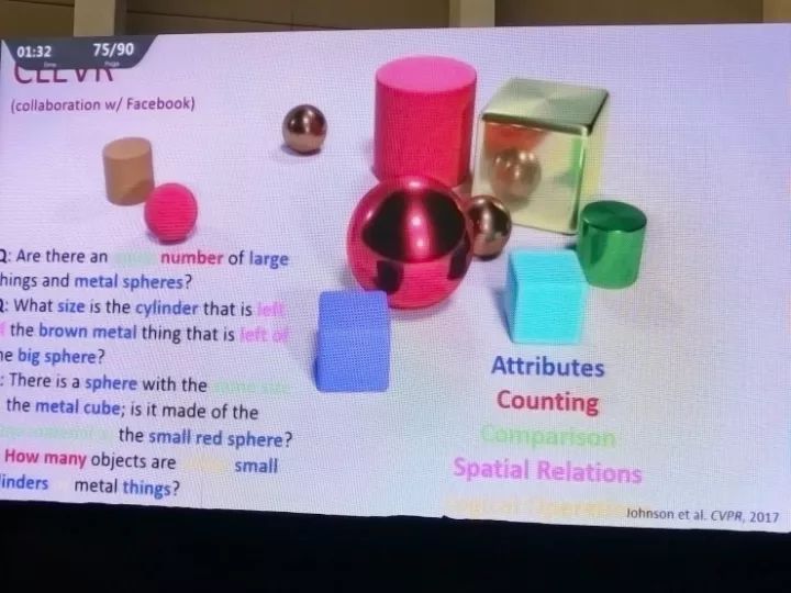 李飞飞团队和Facebook合作重新研究这类问题,创造了带有各种几何体的场景,然后给人工智能提问,看它会如何理解、推理、解决这些问题。这其中会涉及到属性的辨别、计数、对比、空间关系等等。