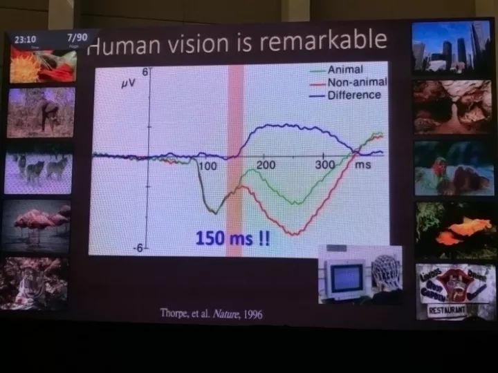 MIT教授Simon Thorpe在1996年的一个实验中,也通过记录脑波的方式表明,人类只需要观察一张复杂照片150ms的时间,就能辨别出其中是否包含动物,不管是哺乳动物、鸟类、鱼,还是虫子。