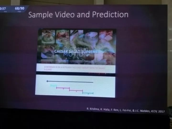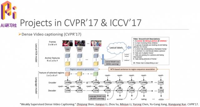 最后简单介绍下我们在CVPR 2017的相关工作Dense Video captioning,主要是做视频描述。在视频当中包含很多内容,而这些内容并不一致,因此视频描述相对来说会比较困难。下图是一些示例。
