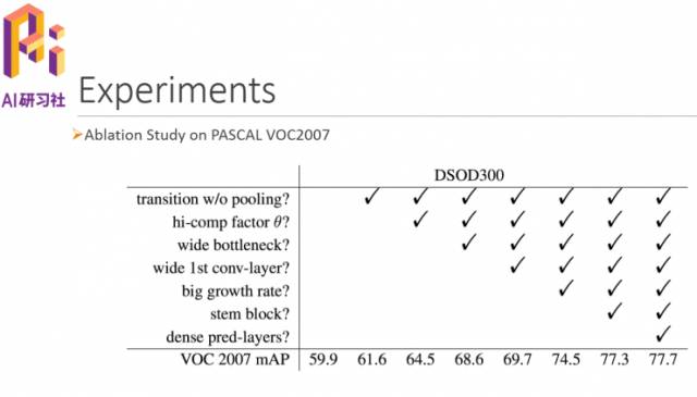 下面是在PASCAL VOC2012上的实验结果,可以看到DSOD有不错的mAP值。