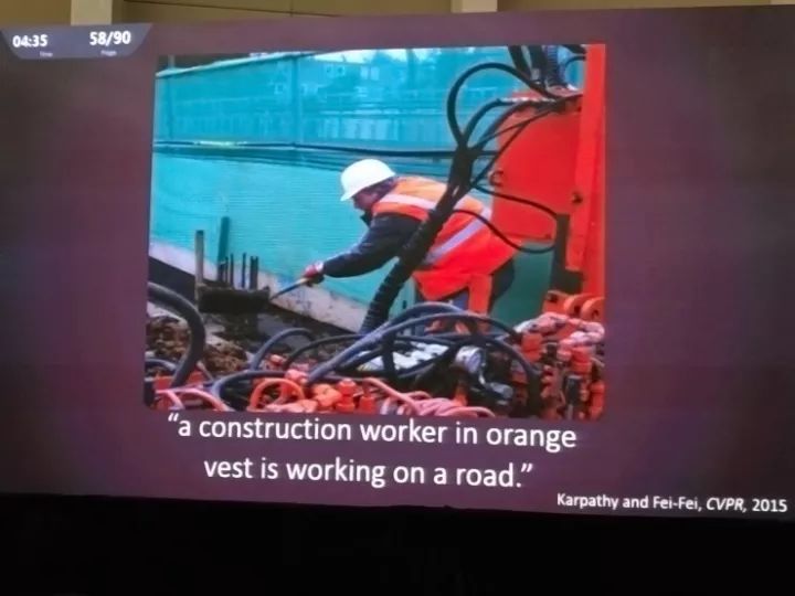 在最近的CVPR2017的研究中,他们让表现迈上了一个新的台阶,不只是简单的说明句子,还要生成文字段落,把它们以具有空间意义的方式连接起来。这样我们就可以写出“一只长颈鹿站在树边,在它的右边有一个有叶子的杆子,在篱笆的后面有一个黑色和白色的砖垒起来的建筑”,等等。虽然里面有错误,而且也远比不上莎士比亚的作品,但我们已经迈出了视觉和语言结合的第一步。