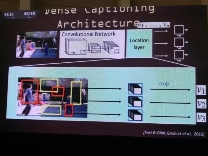 沿着这个方向继续做研究,他们迎来的下一个成果是稠密说明,就是在一幅图片中有很多个区域都会分配注意力,这样有可以有很多个不同的句子描述不同的区域,而不仅仅是用一个句子描述整个场景。在这里就用到了CNN模型和逻辑区域检测模型的结合,再加上一个语言模型,这样就可以对场景做稠密的标注。