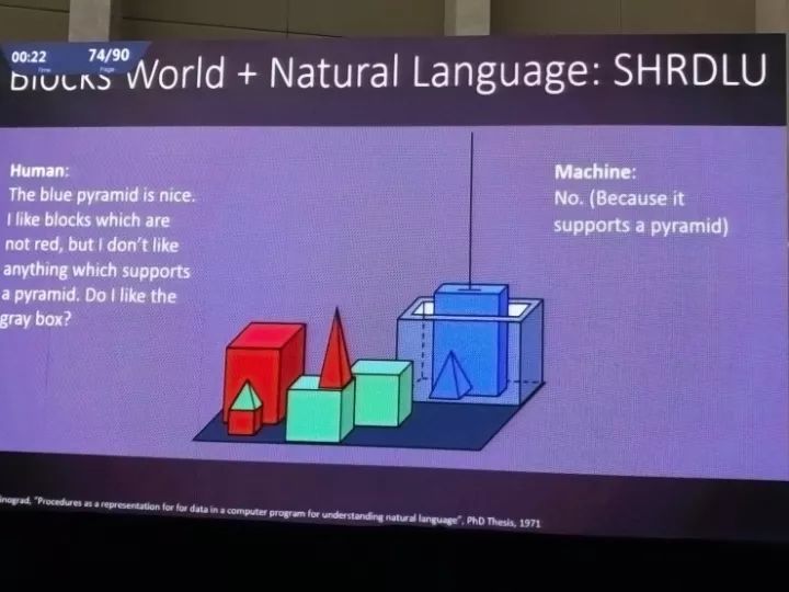 这是一个经典的任务驱动问题,人类说:“蓝色的金字塔很好。我喜欢不是红色的立方体,但是我也不喜欢任何一个垫着5面体的东西。那我喜欢那个灰色的盒子吗?” 那么机器,或者机器人,或者智能体就会回答:“不,因为它垫着一个5面体”。它就是任务驱动的,对这个复杂的世界做理解和推理。