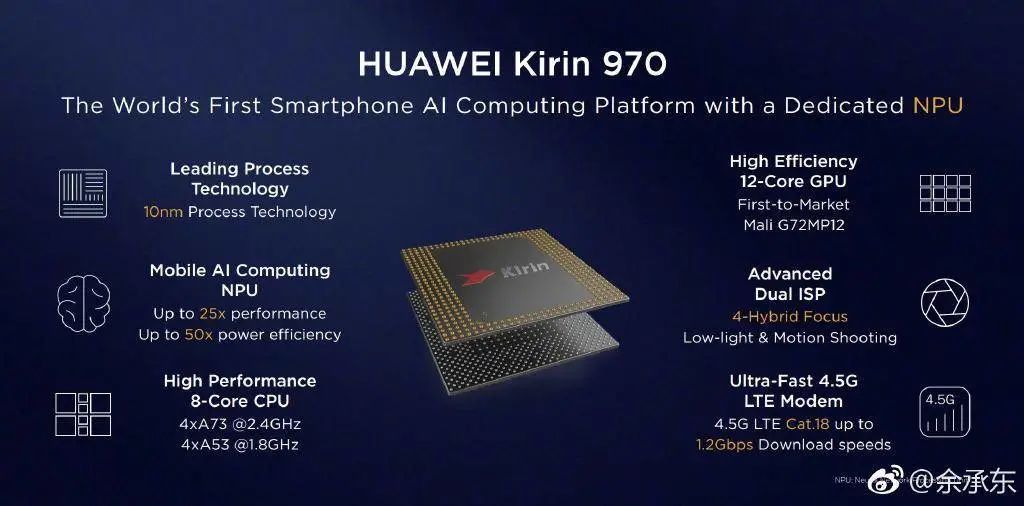 麒麟970就在这样的思考中,成为了全球首款内置独立NPU(神经网络单元)的SoC,这款独立搭载的NPU,能够有效地分担CPU和CPU的压力,并且由于采用10nm的制程工艺,麒麟970在能效方面也比960提升了非常多,搭配上GPU Turbo的技术,让麒麟970总算扬眉吐气一回,一直被诟病的GPU短板也得到了补齐。