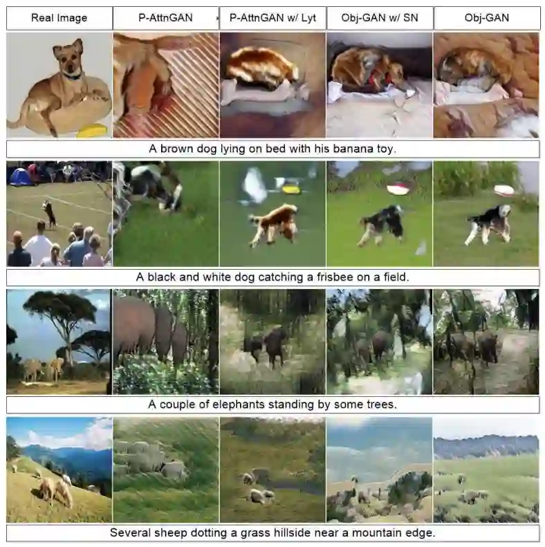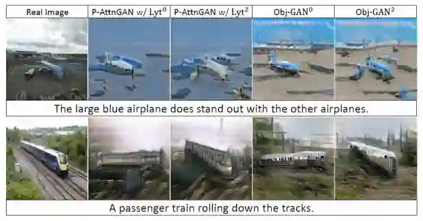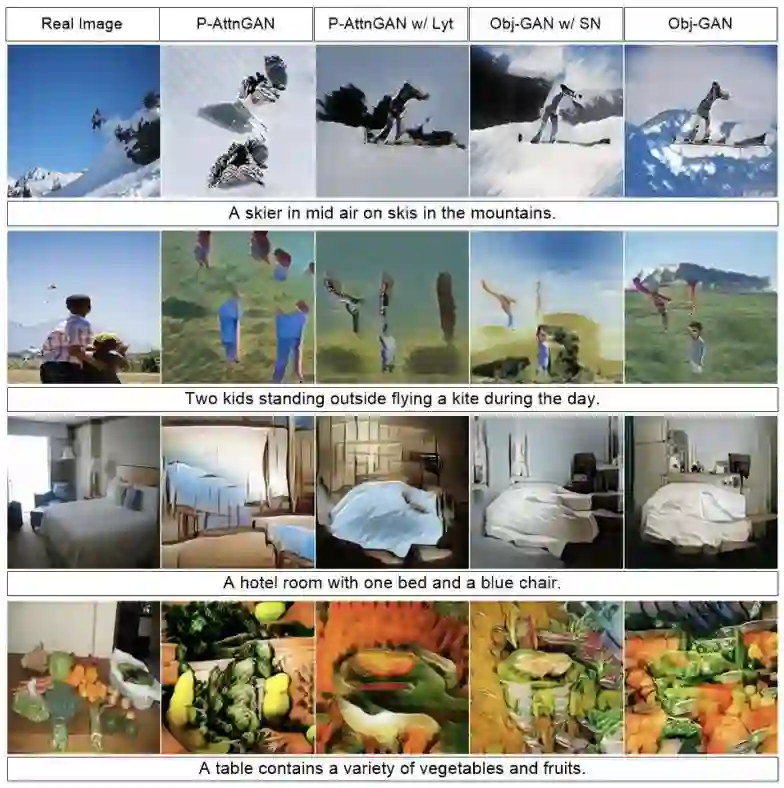 图1的第一行是由AttnGAN生成的图像,虽然图像中包含了人和雪的纹理,但是人的形状是扭曲的,图像布局在语义上是没有意义的。