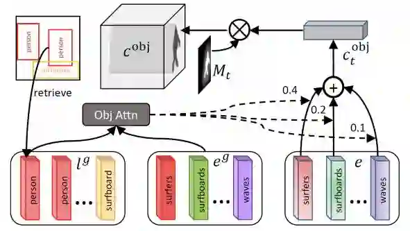 更具体地说,它使用一个新的对象驱动的注意层,使用类标签查询句子中的单词,形成一个单词上下文向量,如图4所示,然后根据类标签和单词上下文向量条件合成图像区域。