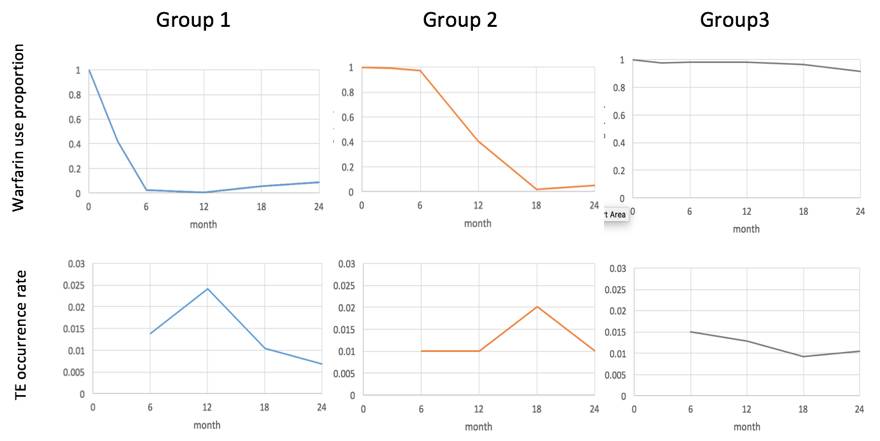 结果显示出华法林用药在人群中呈现出三条不同轨迹。按轨迹将人群分为 3 组后,可观测出与脑卒中的发生有着密切关系。