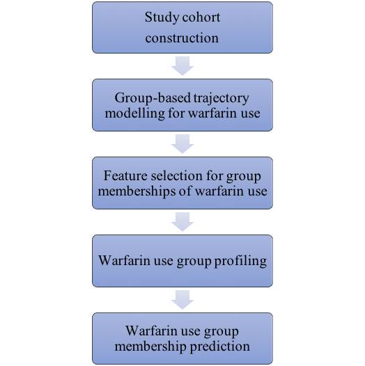 房颤病人有很高的发生脑卒中的风险。对于房颤病人,华法林是一种广泛被医生接受的、用来预防脑卒中的长期口服药。然而,房颤病人对华法林的用药在一段时间内呈现什么特征并不是很明确,比如病人是一直吃药,还是先吃药后停药,还是其他更复杂的轨迹曲线特征。