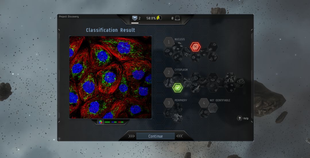 研究人员将人类蛋白质图像的定位分析直接整合到EVE Online中,由此产生名为“Project Discovery”的迷你游戏,然后将玩家的定位与AI系统的定位进行比较,这种AI系统被称为定位细胞注释工具(Loc-CAT)。