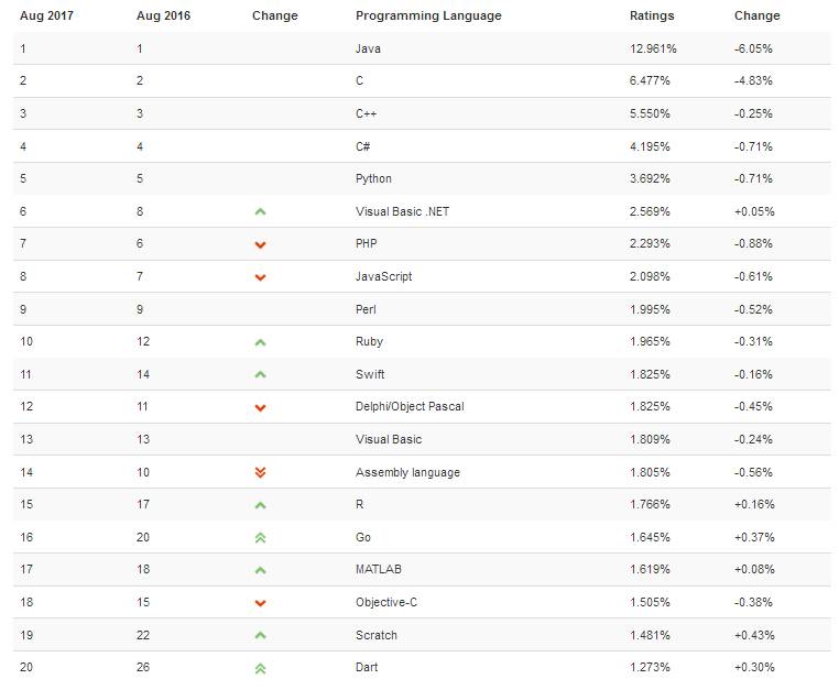 只见过“被死亡”和“被复活”了无数次的依然稳坐榜首的 —— Java 。今年以来,一些比较流行的语言都呈现出稳定下降的趋势,像 Java 和 C 语言就是其中的大代表。C 语言去年底就被爆一蹶不振,Java 语言也一度陷入狗带风波,来看看TIOBE 8 月编程语言排行榜情况如何: