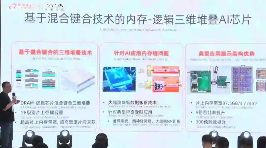 据达摩院介绍,该芯片是全球首款基于 DRAM 的 3D 键合堆叠存算一体 AI 芯片,可突破冯 · 诺依曼架构的性能瓶颈,满足人工智能等场景对高带宽、高容量内存和极致算力的需求。在特定 AI 场景中,该芯片性能提升 10 倍以上,能效比提升高达 300 倍。
