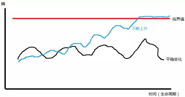 软件系统「熵」有个临界值,当达到并超过临界值后,软件系统的生命也基本到头了。这时,我们就要采取那个迫不得已的行动了。图例展示了软件系统「熵」值的生命周期变化。