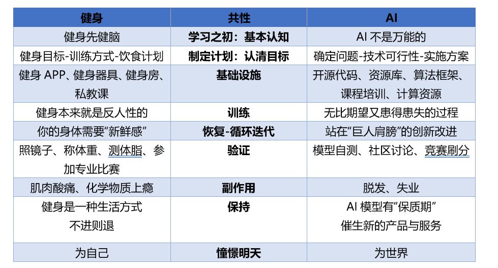 本文从认知-计划-训练-恢复-循环迭代-验证-保持-憧憬等方面找到了训练AI与锻炼身体之间的方法论共性,正如作者所言,可以帮助你在健身房侃侃AI,也可以在敲代码时秀秀肌肉。