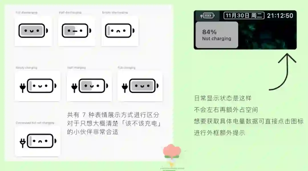 目前应用内会通过上述 7 种表情来展示不同电量下的状态,只要保持让笑脸常在,就不用担心电脑没电啦~应用安装完毕后基本就不需要什么额外操作,只需要没事 check 下小电池图标就好啦。