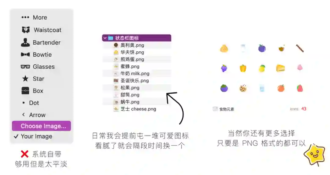 大部分情况下我的图标都会去 iconfont 上搜寻,因为大多都会用户自己投稿的,所以相比那种固定 UI 款式的图标,我更喜欢原创带点主题的生活类图标。毕竟是想让菜单栏变的不那么单调,所以我的图标选择第一标准就是彩色。