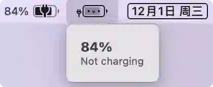 这是同一状态下,两者电量显示的菜单栏图标。如果仅从 UI 图标占用宽度来讲,Battery Buddy 的 UI 操作让图标占用面积上更小了一些。当然,在电量显示上还是系统自带更一目了然。