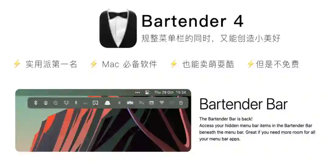 所以从用上 Macbook 的第一天开始,Bartender 就成为了我的必备软件之一。作为图标整理的效率工具,它是完全当之无愧的老大哥。功能实用也方便设置,没有什么上手成本。但是,对于一个喜欢折腾「美观度」的女生而言,这个软件的应用程度肯定不能止步于此。