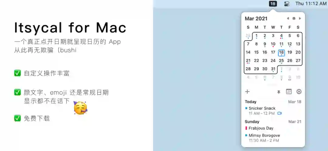 说完了功能,我们来看看 Itsycal 又是如何让菜单栏变的可爱呢?