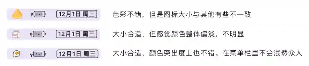 正常情况下我会一次性挑选出 4-5 个心仪的图标,下载下来后再放到 Bartender 里进行实际适配。这里的适配主要是指换上该图标后与整个菜单栏看起来不违和。因为有的图片单看可能很好看,但是放到菜单栏当图标时,可能因为尺寸大小或者颜色饱和度等问题,而造成整体视觉效果不佳。所以多点选择总没错。