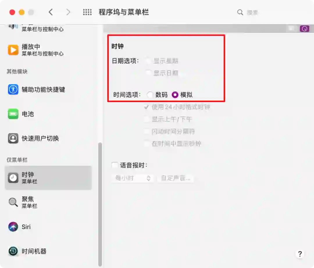 :如果决定使用 Itsycal 作为菜单栏日历显示后,记得把系统自带的日期显示调成最简模式。因为系统自带日期在菜单栏无法选择「完全消失」,并且在 Bartender 的加持下,也无法隐藏。所以建议大家把它调成模拟表盘模式,让其以最小的占地面积出现在菜单栏。